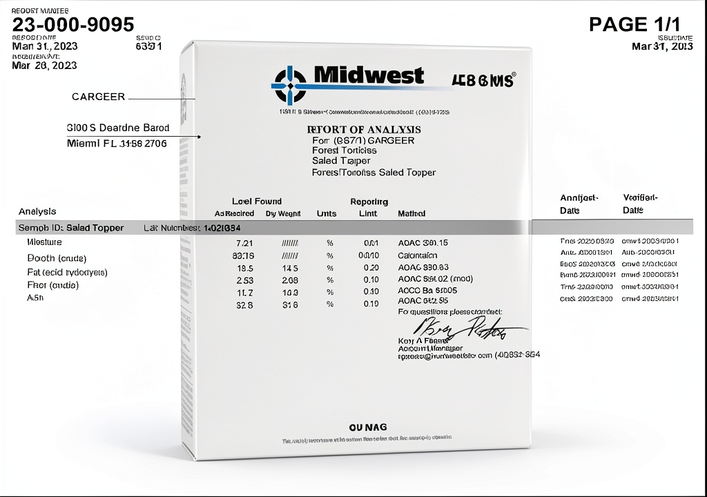 This salad topper is perfect for daily use with reptiles like Red Foot Tortoises, Yellow Foot Tortoises, and other herbivorous or omnivorous species. It can be easily sprinkled over salad greens, fruits, vegetables, or pellets to enhance nutritional value and flavor. Ideal for pet owners seeking to improve their reptile’s diet without complex preparation, it fits seamlessly into home terrariums or professional reptile care settings.