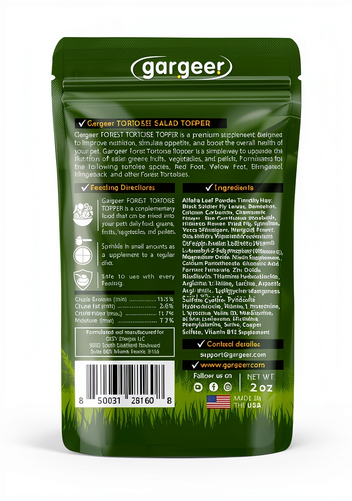 Gargeer Salad Topper is a premium nutritional supplement designed for reptiles such as tortoises, iguanas, and skinks. It features high-quality ingredients including Alfalfa Leaf Powder, Timothy Hay, and Black Soldier Fly Larvae to deliver essential vitamins, minerals, and antioxidants. This product supports overall health, immune system strength, and vitality, making it an ideal addition to your pet’s diet. Each package contains 2 ounces of topper, with options like Forest Tortoise, Iguana, Blue Tongue Skink, Grassland Tortoise, and Dragon varieties to suit different reptile species.