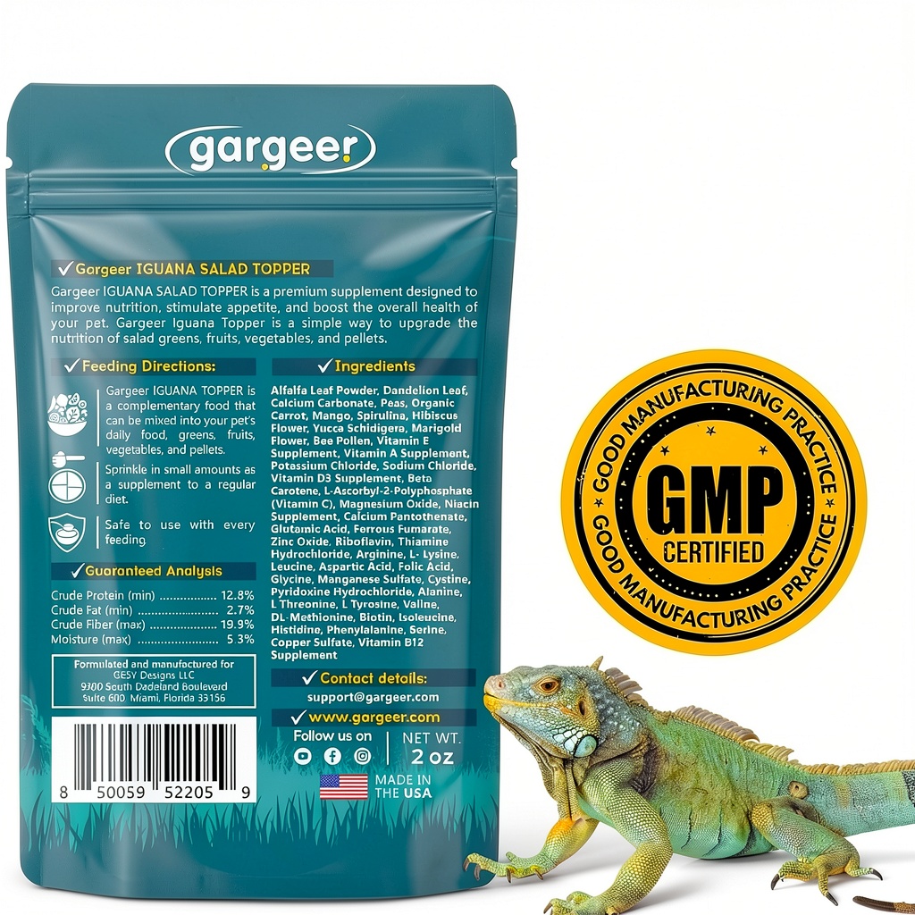 Gesy Designs Salad Topper is a premium nutritional supplement designed for reptiles such as iguanas, tortoises, and skinks. Each 2-ounce pack contains high-quality ingredients like alfalfa leaf powder, dandelion, and calcium carbonate, providing essential vitamins and minerals for optimal health. This product supports digestion, appetite stimulation, and growth, with a formulation developed by an experienced herpetologist. It is manufactured in the USA, ensuring strict quality control and reliable results for your pet’s diet.