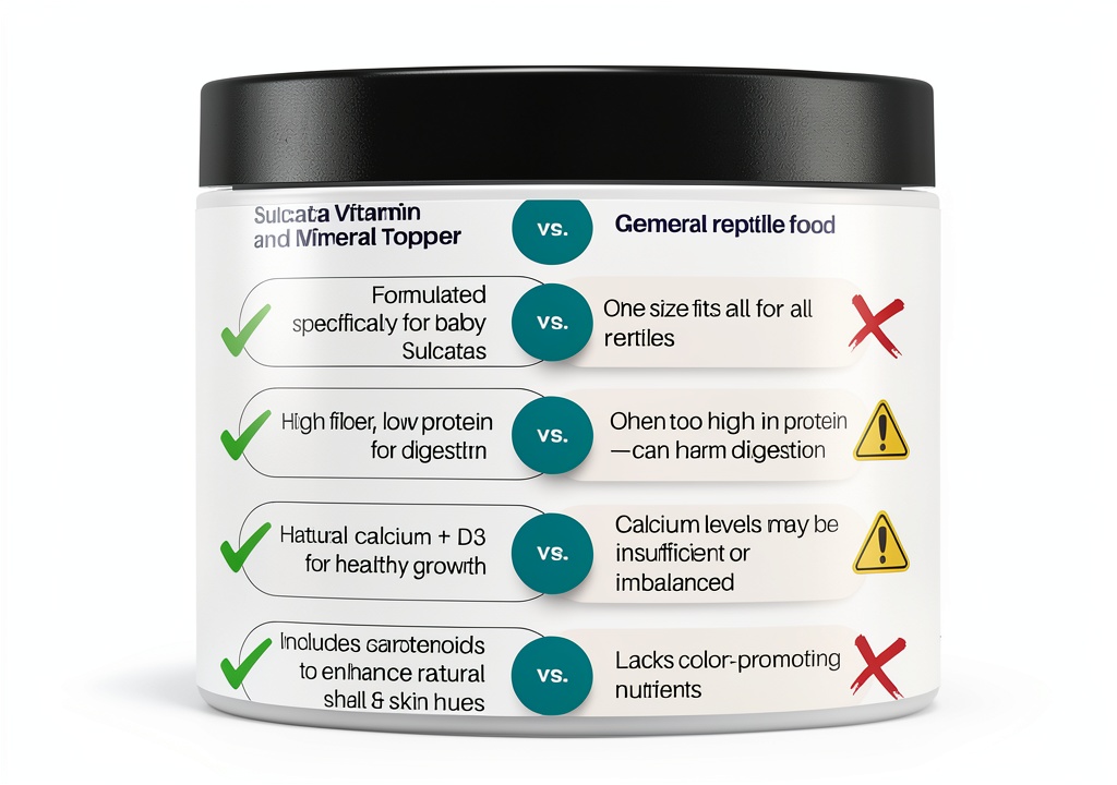 Our product stands out due to its scientific formulation by reptile experts, ensuring it meets the specific needs of sulcata tortoises. We use pure organic ingredients and provide a comprehensive care bonus pack, including a nutrition guide, webinar, coupon, and growth journal. This commitment to quality and support helps prevent health issues and fosters long-term tortoise vitality.
